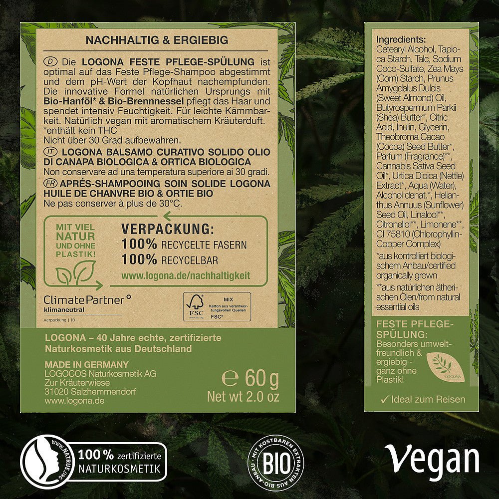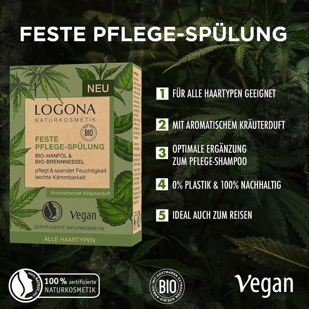 「ロゴナ ソリッドシャンプー」の仕上げに。ヘンプ種子オイルとセイヨウイラクサエキスを配合した革新的な処方の固形ヘアコンディショナーです。髪を保護しながら櫛どおり良くつややかな髪に導きます。